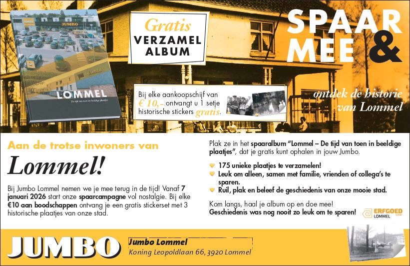 Op woensdag 7 januari 2026 is het zover. Dan start in Jumbo Lommel, op de Koning Leopoldlaan 66, de stickerspaaractie voor het historisch verzamelalbum ‘Lommel. De tijd van toen in beeldige plaatjes’. Acht weken lang kunnen de klanten van Jumbo sparen voor een serie van 176 stickers die een fraai beeld schetsen van de geschiedenis van Lommel. Bij iedere besteding van 10 euro aan boodschappen krijgt de klant een set van 3 historische foto’s. De plaatjes kunnen verzameld worden in een prachtig album dat speciaal voor deze actie ontwikkeld is. Dit verzamelalbum kan de klant vanaf 7 januari 2026 gratis verkrijgen in de winkel. Er is een grote hoeveelheid albums gedrukt, maar op = op! Wees er dus snel bij.